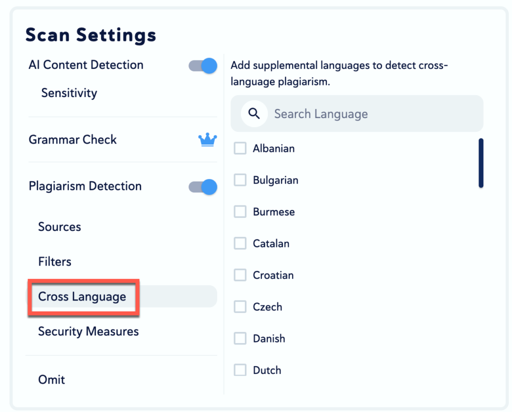 - Cross Language: the ability to specify the additional language in which you would like to scan for results.