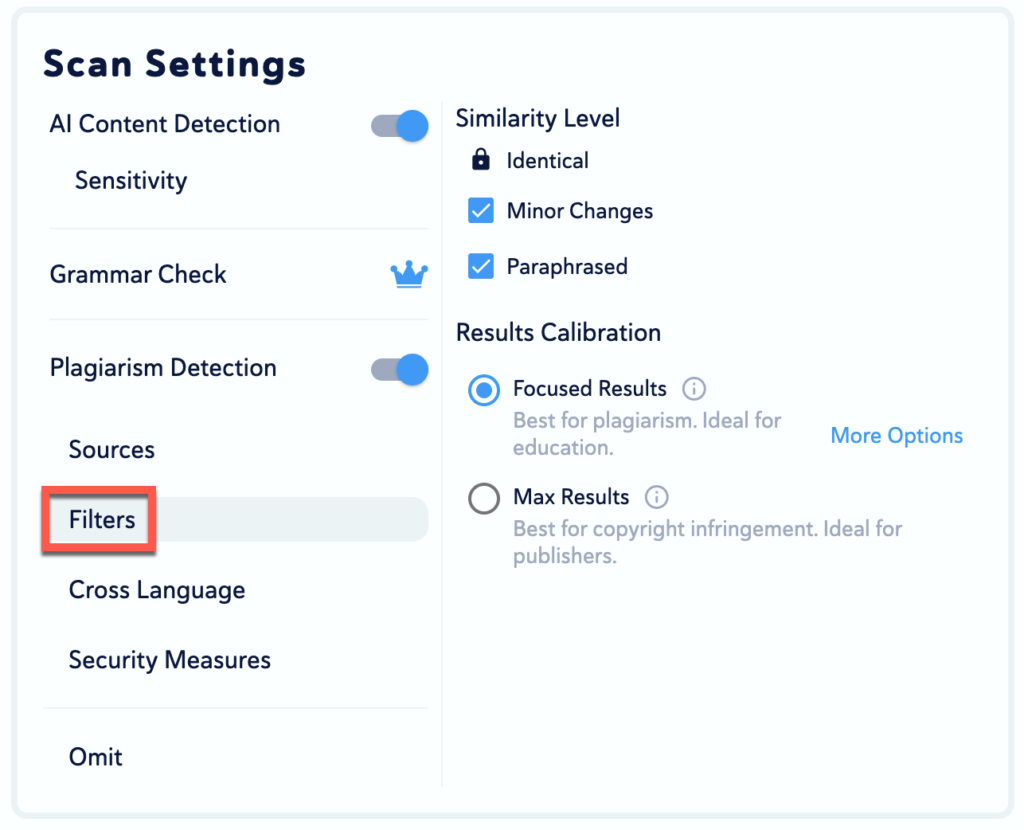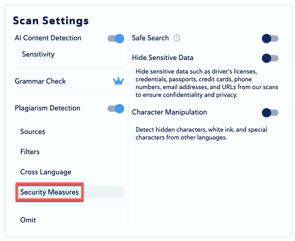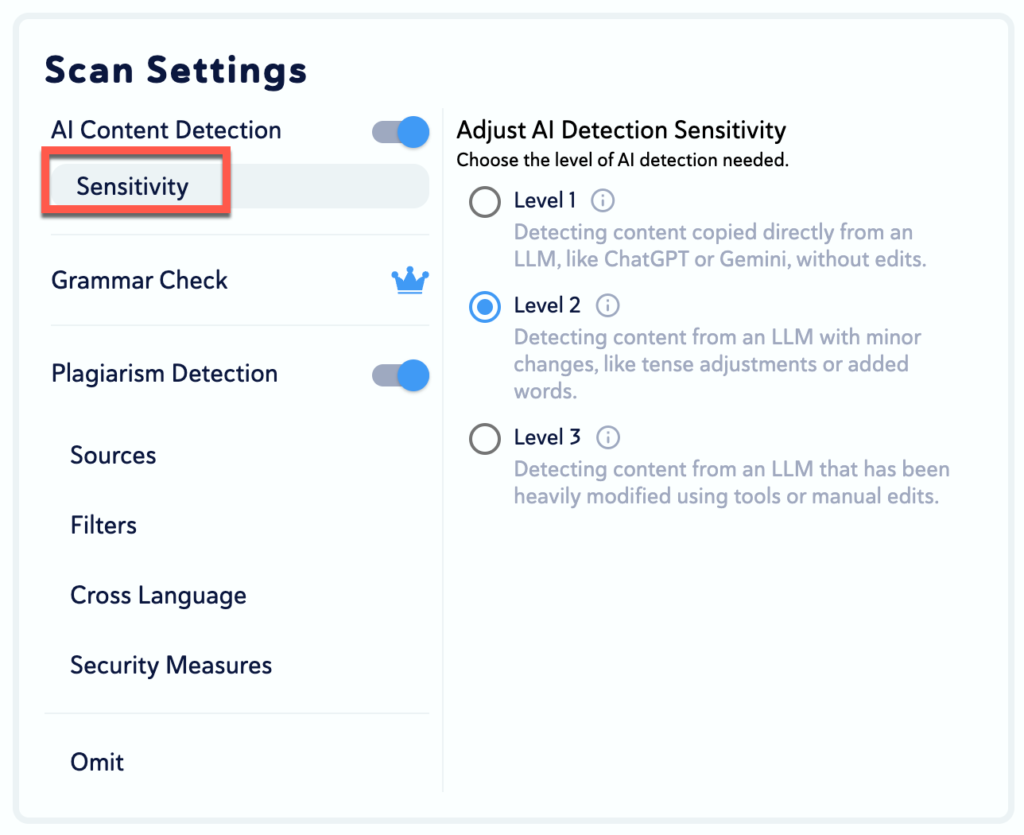 - Under Detection Capabilities, you can turn off or on the AI and Plagiarism check; they are both on by default. (We do not offer Grammar Check).