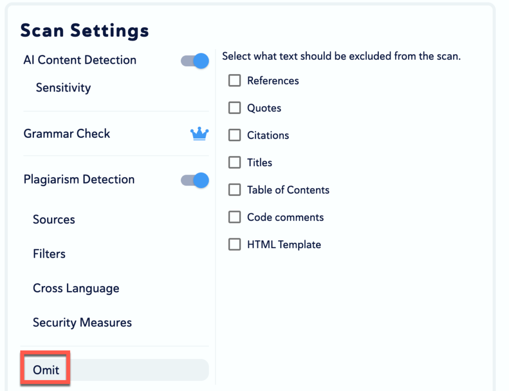 - Omit: The ability to exclude components from the plagiarism detector.