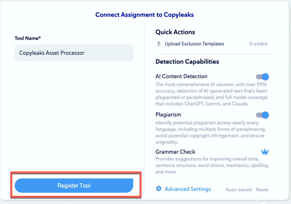 - Click the Register Tool to add Copyleaks