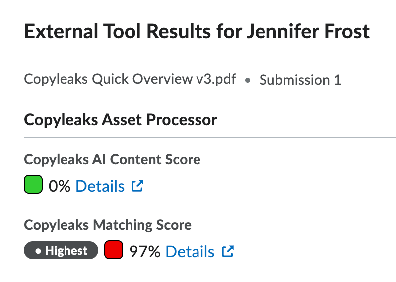 After a student submits a file, the instructor can view the report in their assignment view under External Tool Results.