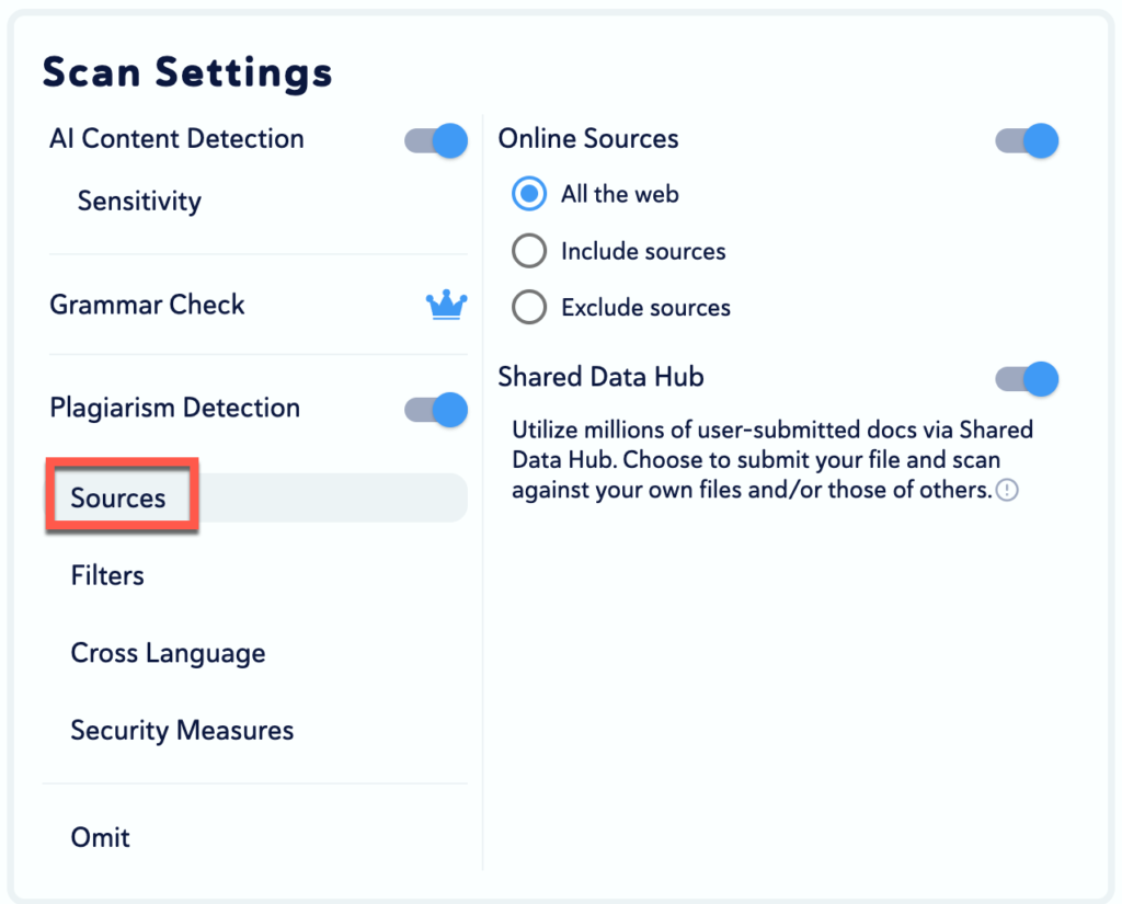 - Online Sources: You can choose to have the scan include all the web sources, select specific sources only, or exclude certain sources.